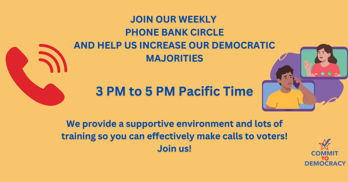 We are excited to have our Wednesday phone bank circle up and running for the 2026 elections, and we are excited to have you join us. We are a supportive group of dedicated volunteers who phone bank together weekly. We welcome anyone into our circle and hope you can join us. We offer all the training and support you need to be successful. Welcome!