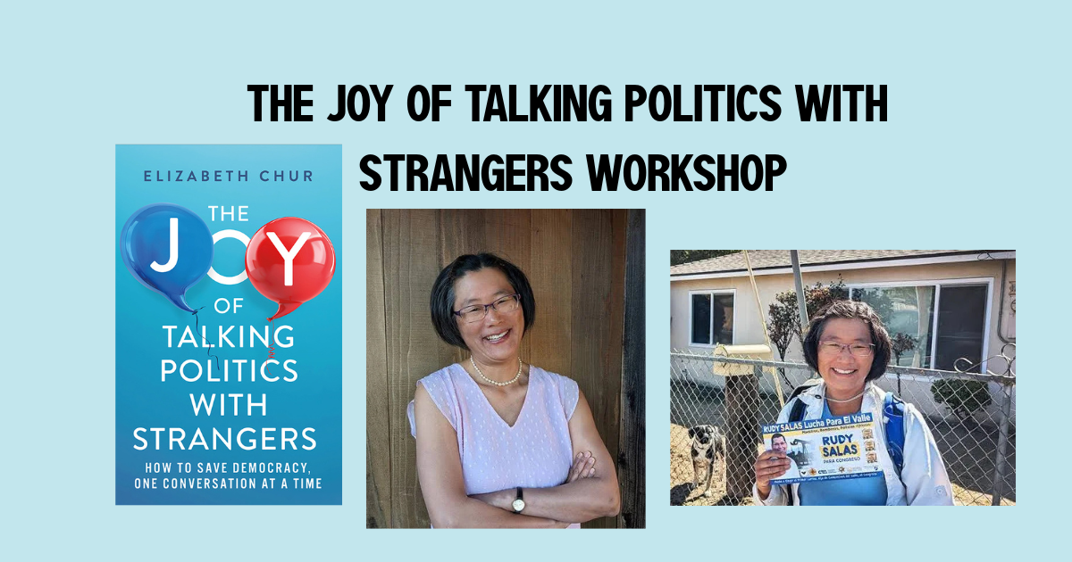 In this interactive 75-minute workshop, Elizabeth Chur, author of The Joy of Talking Politics with Strangers, demonstrates how to use curiosity and empathy to engage with “high-potential” voters—those who rarely or never vote. These fellow Americans are often just waiting for someone to listen without judgment.